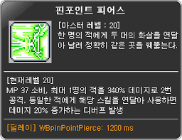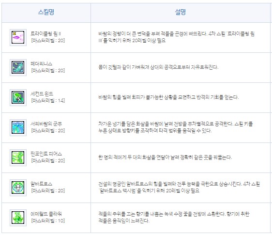 3차전직을 하게 되면, 이제 중요하다고 할 수 있는 스킬들을 배우는데 첫번째는 핀포인트 피어스입니다. 이게 뎀상승 20퍼가 있어서 나중에 루타비스 도실때, 핀포인트 피어스 + 천공의 노래 + 몬순과 같은 연계로 사용하면 좋습니다. 이제 트라이플링 웜을 배우면 배울수록 많이 나타나게 되는 시점이 됩니다. 두번째는 알바트로스 입니다. 이건 피통과 공격력을 동시에 상승시켜주는 버프인데요. 상시 유지하면 좋습니다. 사냥기로는 서리바람의 군무가 있는데, 이게 맵을 상하좌우로 움직이면서 사냥을 할수 있어서 저렙사냥터에서는 아주 효율적입니다. 마지막으로는 에메랄드 플라워가 있는데, 이게 어그로를 끌어주는 물체를 소환해서 나중에 보스잡으실때 유용한 스킬입니다.