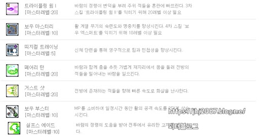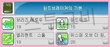 이런 스킬들을 배우게 됩니다. 윗점은 시그너스 직업군들이 공통으로 가지고 있는 스킬들이라 당연히 있고 이동기인 윈드워크, 패시브인 위스퍼 오브 더윈드, 버프인 엘리멘트 스톰(이거 계속유지하면 좋습니다.), 공격기인 브리즈 에로우를 배우는데,