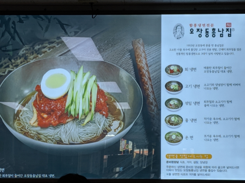 첫번째 함흥냉면 맛집은 오장동 흥남집(본점)입니다. 이미 유명한곳이라서 지역마다 지점이 있을정도로 번창한 곳이더라구요. 무려 1953년에 개업한 이래 4대째 가업을 이어받아서 운영하고 있다고 합니다. 저는 상경까지는 아니지만 서울과 가까운곳에 취직하면서 평양냉면과 함흥냉면을 둘다 먹어보았는데, 평양냉면은 좀 극단적으로 말하면 수돗물맛이 나서 도저히 먹질 못했습니다. 하지만 함흥냉면은 맛있는 비빔장에 회무침+쫄깃한 면발로 너무 맛있게 잘먹었던 기억이 있습니다. 사람의 입맛이 서로 달라서 무엇이 맞는지는 모르겠지만, 무난한 입맛을 가지신 분들이라면 오장동 흥남집의 냉면을 추천드립니다.